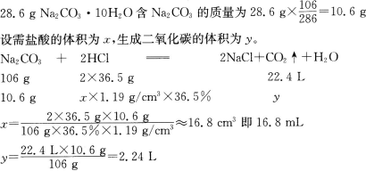 31.28.6g Na2CO3·10H2O与质量分数为36.5%(密度1.19g/cm3)的盐酸完全反应,消耗这种盐酸溶液多少毫升?在标准状况下,反应生成多少升二氧化碳?