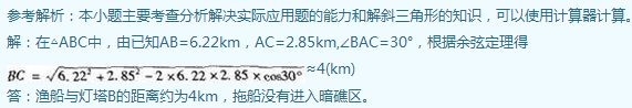 第20题 海面上以灯塔口为中心,半径为3.8km的圆形区域内为暗礁区渔船航行至海面上C处,从岸边的观测站A测得AB=6.22km,AC=2.85km,∠BAC=30°。计算此时渔船和灯塔B的距离并判断渔船是否已经进入了暗礁区(计算结果的公里数保留到个位)